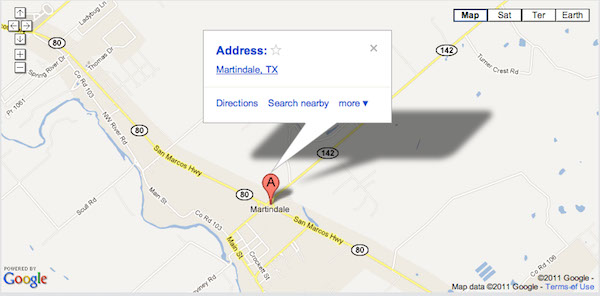 Interstate 10 West past Columbus to Luling. Exit on Highway 90 North/West to Luling. Downtown at the main railroad crossing take a right on Highway 80 and 183. After a couple of blocks Highway 80 then turns left; stay on Highway 80 for about 16 miles to Martindale. (Note: Do NOT continue straight on Highway 163 North).